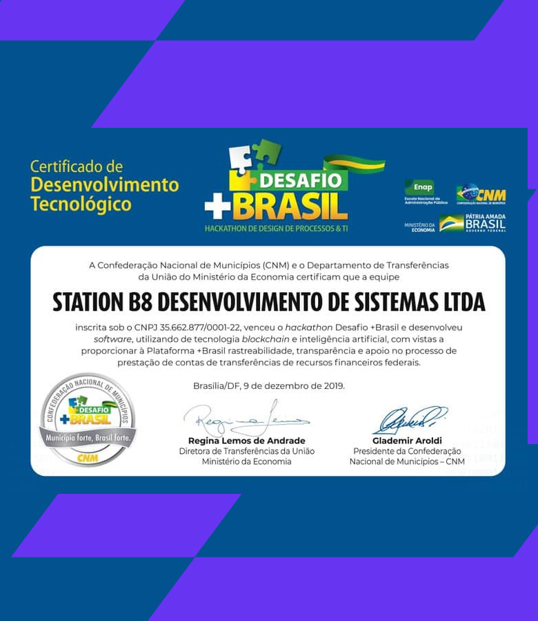 O início dessa dinâmica se deu no começo de 2019, por meio do hackathon Desafio +Brasil, organizado pela Confederação Nacional de Municípios e pelo Ministério da Economia. O propósito desse hackathon era encontrar ideias em desenvolvimento de tecnologias que pudesse ser aderente à plataforma governamental +Brasil, utilizada para a transferência de recurso da União aos municípios. Esta ação nos rendeu não somente o reconhecimento, como nos direcionou ir adiante assumindo novos desafios de oferecer sistemas de gestão inteligentes para empresas públicas e privadas.